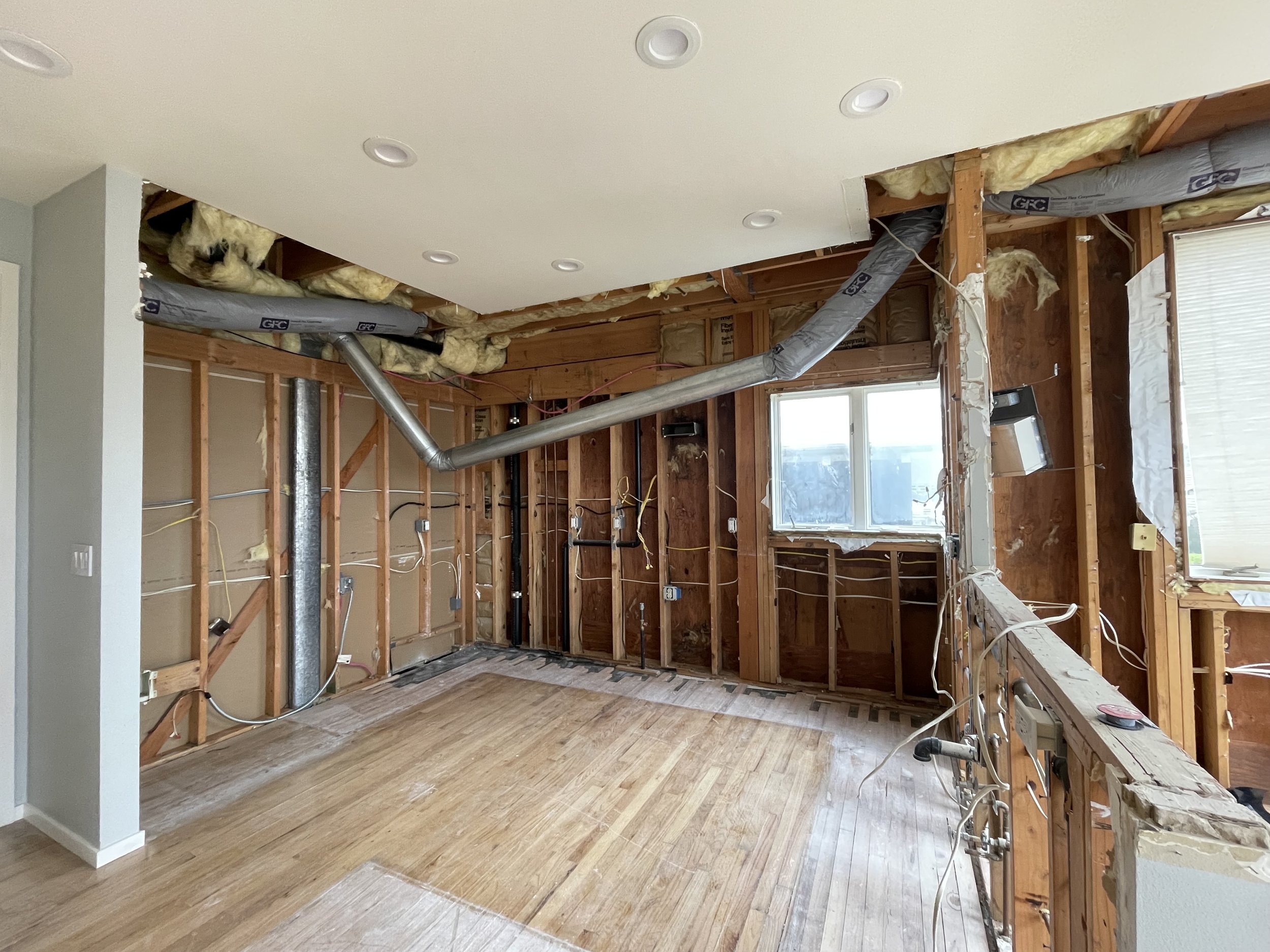 Extensive interior remodel of residence in the Magnolia neighborhood of Seattle. Expanded corner of building footprint to create larger Kitchen and Guest Bedroom spaces. The addition of corner glazing in the Kitchen captures more daylight and expansive views of the waterfront. Interior partitions and small storage areas were removed to foster an open flow between Kitchen and Living areas. On the lower level, a Storage closet was converted into Kitchenette for Guest use.